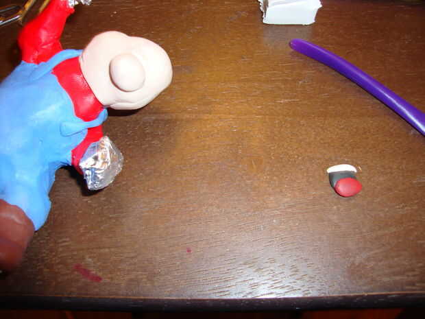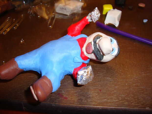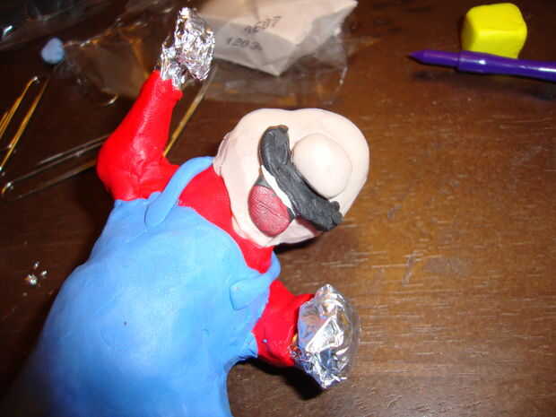 Luego rodó hacia fuera un pedazo de negro y cortar su bigote a la medida y presiona sobre la cara de Mario.