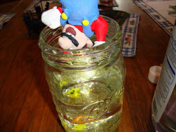 Mario caiga en la jarra y ver cuánto más aceite se puede añadir.  Lentamente vierta más aceite dentro del frasco.  Caer en tu estrella (porque la estrella es divertido) deja una pulgada a una 1/2 pulgada de espacio en el tarro así que usted puede mover fácilmente alrededor de los materiales.
