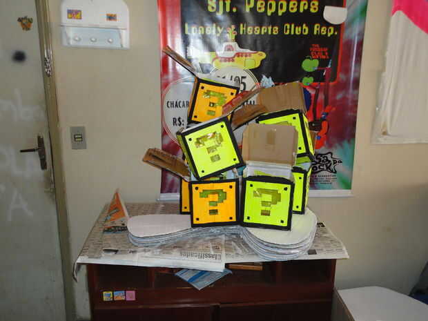 Cortar el celofán y pegamento dentro de la caja para cubrir los signos de interrogación.