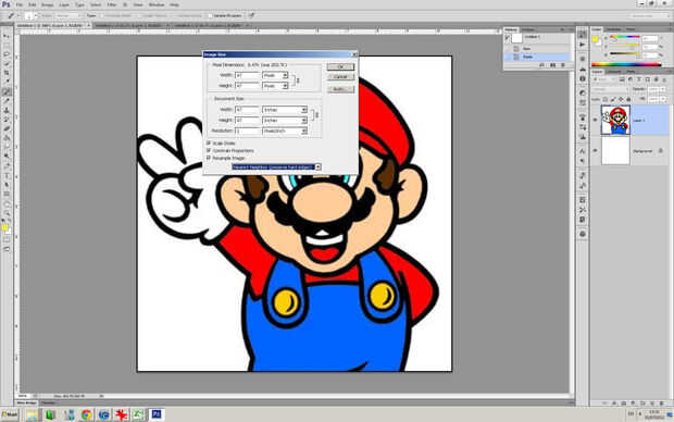 3. vaya a imagen--> tamaño de imagen: primero asegúrese de que estén marcadas todas las casillas. Continuación, elija a "Vecino más cercano" como el método de re muestreo. En tamaño del documento cambiar alto y ancho al número de piedras de mosaico en una fila (anchura) y en una columna (altura) en puntos por pulgada, seleccione "1". Por ejemplo, era mi mosaico 37 "* 37" y mis piedras de mosaico fueron unos 0,8" para 37 dividido por 0,8 = sobre 47 piedras en una fila y una columna. Debido a que cada piedra representa un píxel - elegimos un píxel por pulgada. Aplicar los cambios.