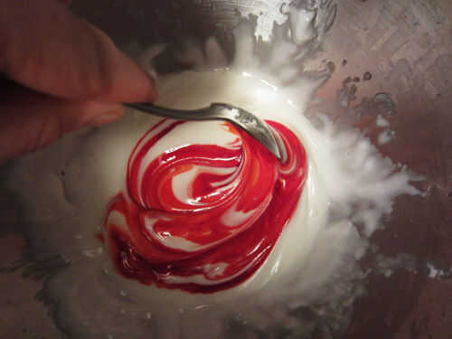 Añadir unas gotas del colorante rojo en el royal icing y mezclar.