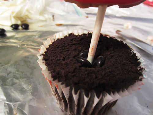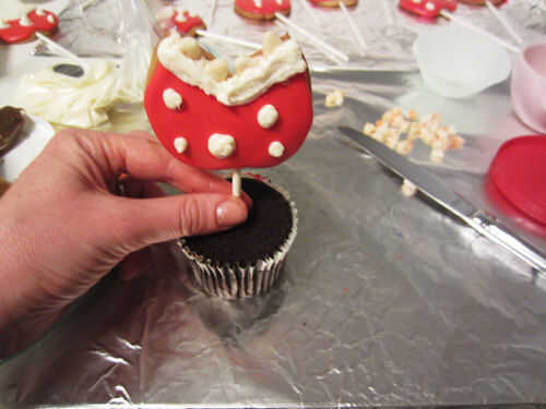 Tomar una galleta por el palillo y empuje en el Magdalena. Si su cookie necesita ser estabilizado como mina, agregar unos M & Ms alrededor del palillo del lollipop.
