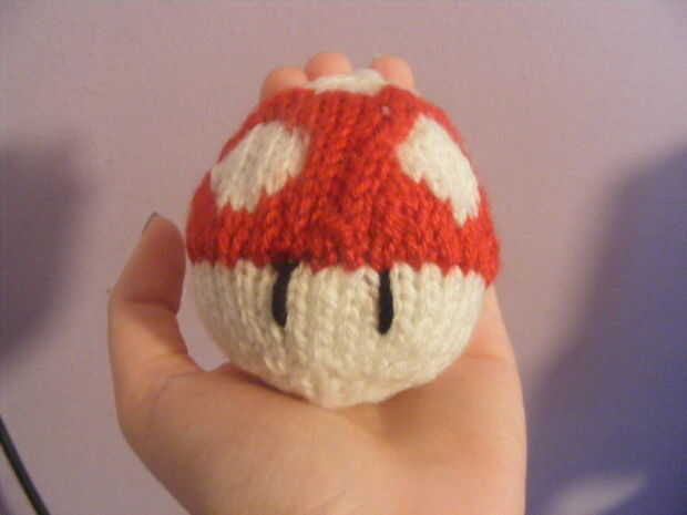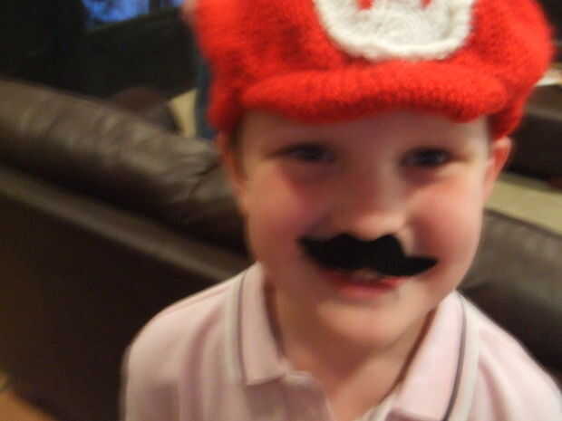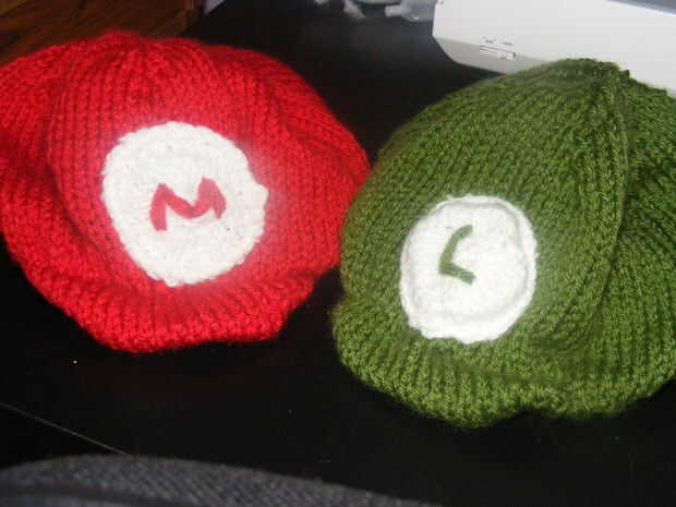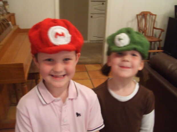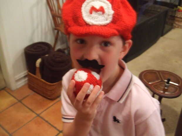 He hecho dos tapones (utilizando una versión ajustada de este patrón de gorra de vendedor de periódicos ) en los colores rojo y verde. Entonces, hice dos pequeños bigotes, corte de una hoja de fieltro negro. Y, por supuesto, Mario y Luigi nada sería sin una seta mágica o dos, así punto para encender una pequeña felpa (utilizando este patrón como guía).