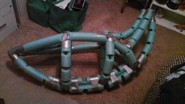 hice el prototipo esqueleto de tallarines de la espuma y cinta adhesiva. Cinta, no demasiado aislante ya que necesitaba que desarmarse fácilmente.  Fue más fácil de montar y volver a montar hasta que lo conseguí.  Una vez que fue hecho, procedí a esqueleto de tubo de PVC