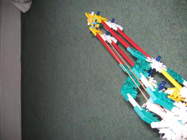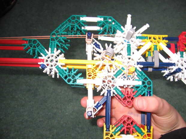 Enganchar la goma en la frente poco amarillo en el extremo del cañón y en una de las clavijas del blanco en la rueda de carga.