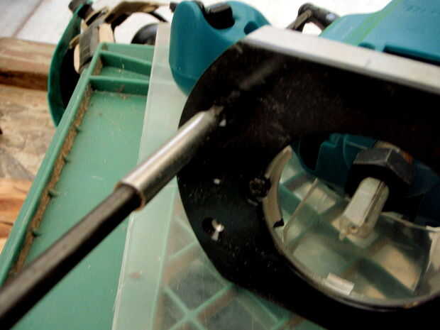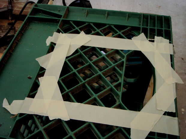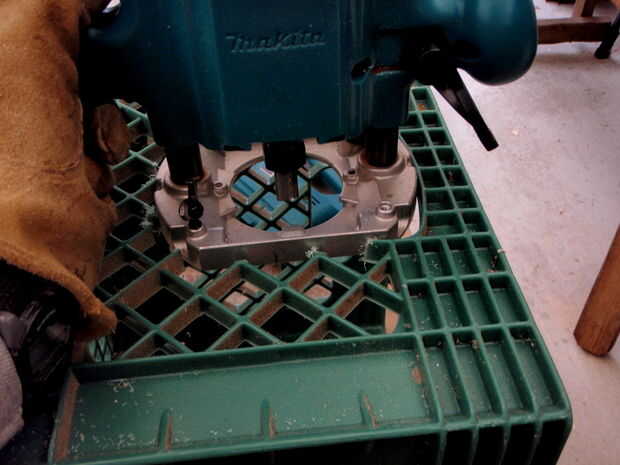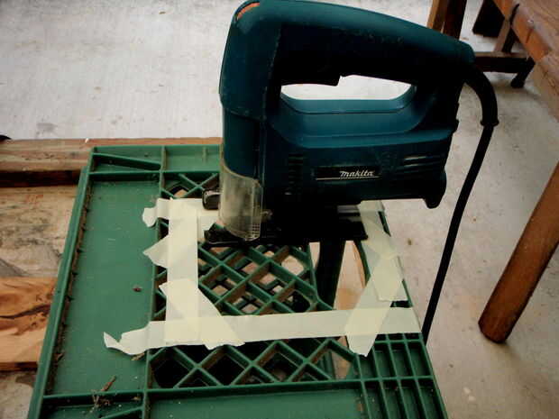 Retire la base del router. Configurar router en lado del cajón de leche hacia la apertura. Utilice cinta de enmascarar para marcar el perímetro del router. El agujero tiene que ser un poco más grande para un ajuste de la distancia del router. Utilizando a algún tipo de herramienta de corte como una sierra de vaivén corta la zona marcada. Compruebe que se ajusta en el orificio fácilmente por lo que se puede quitar cuando no desea utilizar su nueva mesa de router.