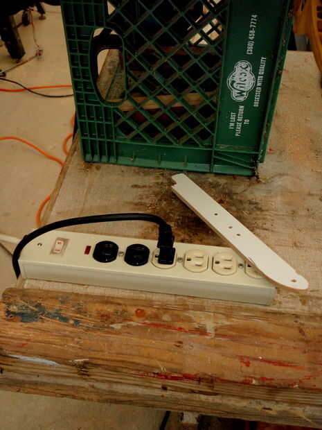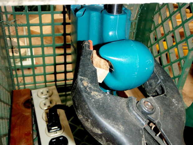 Corte un bloque de madera que permitirá una abrazadera de resorte apretar el gatillo. Utilice una tira de la energía como un interruptor remoto junto a la mesa de fresadora. Corte a un empujador de palillo o dos para la alimentación de madera siempre que sea cerca de la cuchilla.