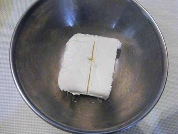 Primero poner el queso crema en un tazón para batir y crema en la batidora. Debe tener una consistencia de betún. Dejar esto de lado.