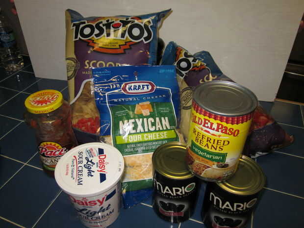 En cubitos de tomates Lechuga Queso rallado de su preferencia Aceitunas negras Tostitos cucharadas! Chips de tortilla Habas de riñón Crema agria OPCIONAL: Taco sazonada carne molida de res Una hoja de galleta Aerosol de cocina antiadherente