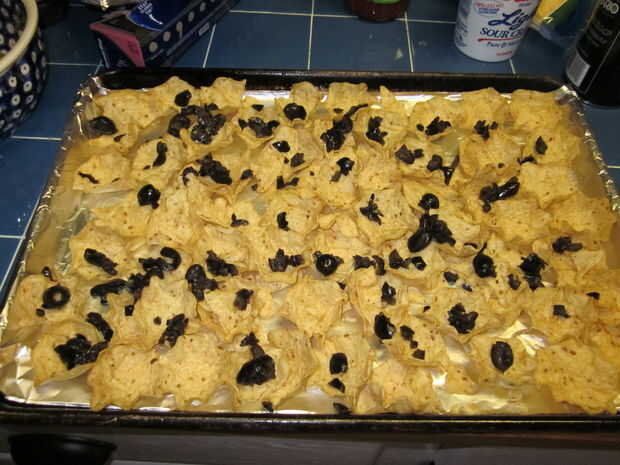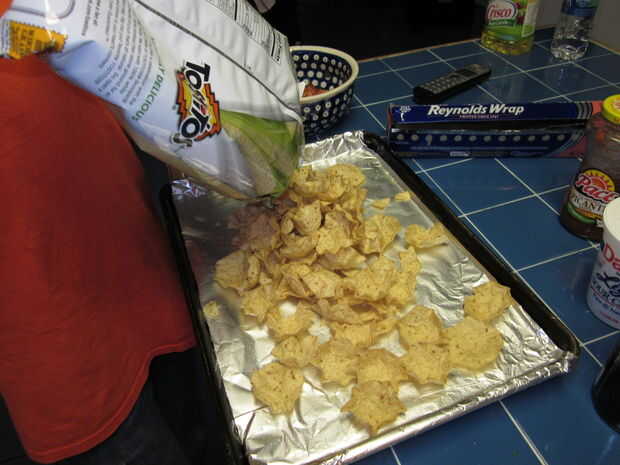 Aplique una capa de virutas en la bandeja para hornear galletas y propagación alrededor de todos los ingredientes excepto la crema agria y lechuga.