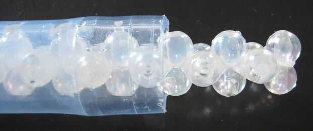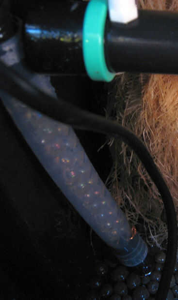 Hice uso de bolas de plástico y caliente derretimiento pegamento, aunque el pegamento no es ideal para uso sumergido. Tenía una longitud de ocho pulgadas de tubo de pvc conectado mi bomba para la pieza T, 48 granos (24 pares) bien equipadas.