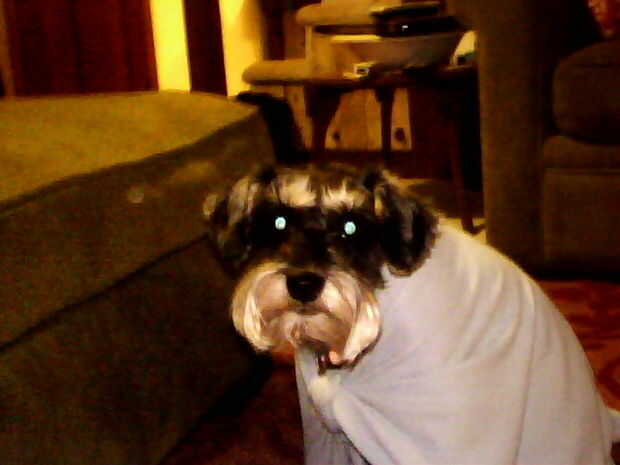 Empezamos poniendo la manta sobre el perro y empatando lo apretado (no a ajustado) alrededor el cuello del perro como una capa.