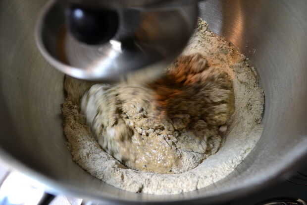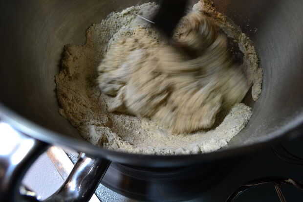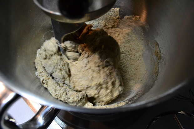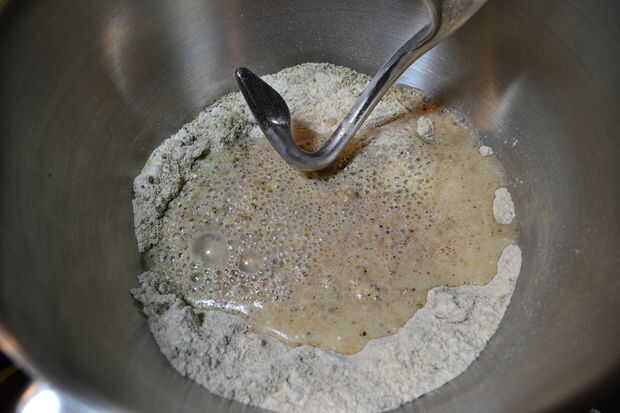 Agregar la mezcla de agua y la levadura a los ingredientes secos y empezar a mezclar en baja. Continuar amasando hasta que la masa empiece a venir juntos.