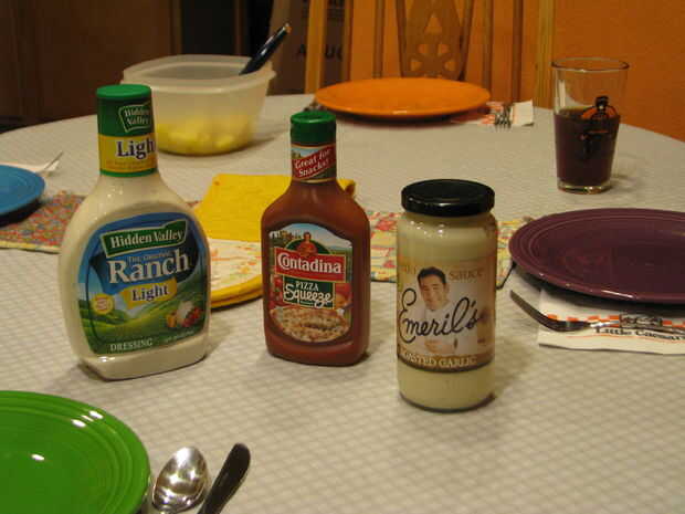Llegar a la salsa que sumerge (estaba en la lista de ingredientes para pizza pollo) te recomiendo marinara, salsa blanca y mi favorito (y no realmente una salsa de pizza tradicional) aderezo ranch. Mezclar y combinar para complacer a su favorito exquísitos.