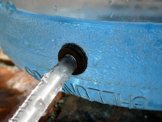 Utiliza un recipiente de agua reciclada suelen encontrarse en enfriadores de agua de la oficina e instalado un aproximado de la tubería plástica de 1/4 de pulgada 50 pies de largo a través de un ojal de goma en el lado. Esto es solamente una presión de ajuste, pero fue muy apretado por lo que nunca ha habido una fuga.