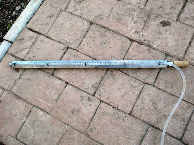 El extremo de la tubería plástica os adjunto una pieza larga de 24 pulgadas de conducto de reciclado 1/2 pulgada con una regla de 24 pulgadas, conectada con las correas del zap. No enchufe el extremo del agujero del tubo!!! Cuanto más la regla la latitud más tendrás al realizar mediciones fuera de la zona de tus límites de depósito.