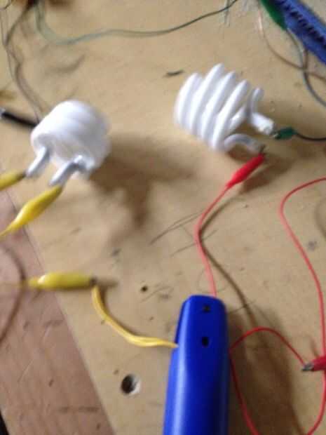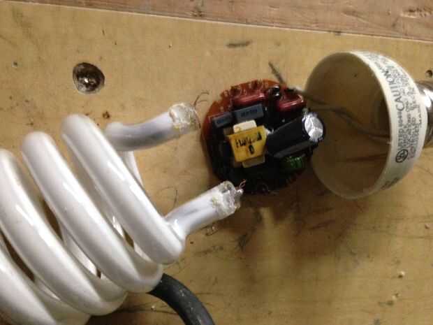 Para obtener bombillas cfl, corte alrededor de la línea entre la parte superior de la cubierta del circuito de la luz y el fondo, que tiene el circuito y la base de tornillo. Una vez terminado, corte los cables de la bombilla a la placa de circuito. Quitar el pegamento que sostiene el bulbo de cristal en la tapa de plástico. Ahora tienes la bombilla. Esto funciona para la mayoría luces fluorescentes compactas. Podría tener dos, aunque funciona con uno, generalmente, y con 1, arranca mejor. Estos aumentan la frecuencia y actúan como resistencia para que el zapper del insecto no se destruye.