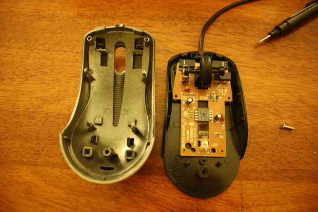 Localizar un tornillo en la parte inferior del ratón, quite el tornillo y separe las dos partes del ratón.