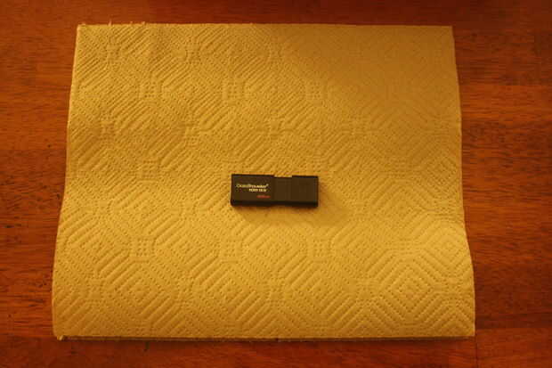 Lugar todo lo que quieras ocultar en la toalla de papel y rodar para arriba. Dos capas de toalla de papel es suficiente.