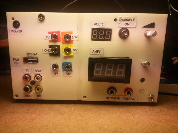 Complementos mano: he añadido un conector de 12V para un ventilador de usar como un extractor de humos de soldadura y también añade un puerto usb y conectado directamente en el riel de 5V USB impulsada por dispositivos. No sé si se recomienda para cargar el teléfono móvil en una fuente de energía que puede entregar fácilmente más de 20A pero no más lento de carga :-)