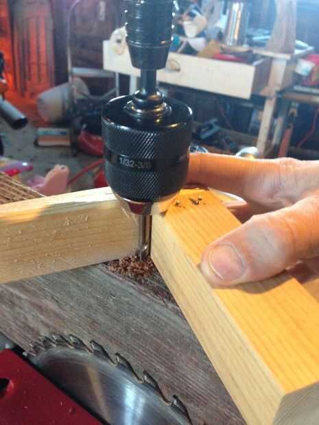 3. taladrar los orificios utilizando mi pedacito redondo de 5/16 taladro a guía y vuelva a perforar los agujeros con mi granito de arena de madera de 3/8.