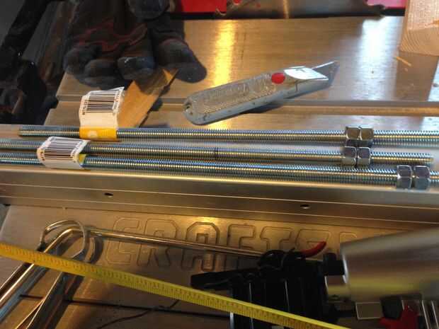 Después de algún pensamiento y paseando por la tienda de hardware, mi respuesta llegó en dos palabras, barra de lechón. También se llama varilla roscada, estas barras son como tornillos largos sin cabezas. Estas son las armas secretas que este estante oculto fuerte. Elegí barra de lechón de 3/8 de pulgada.