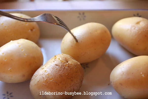 Escurrir las patatas, Trinche con un tenedor y colocarlos en una fuente para horno de cerámica. (Si utilizas un plato hecho de otros materiales tiempos de cocción pueden variar)