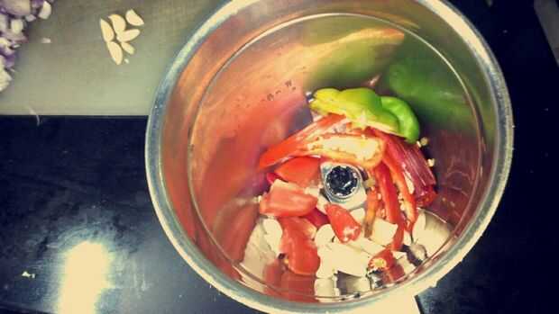 Mezcla el ajo, los chiles, tomate y la mitad de la pimienta.