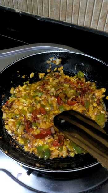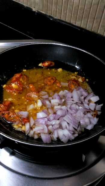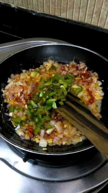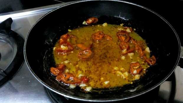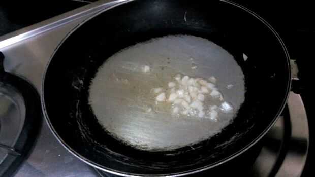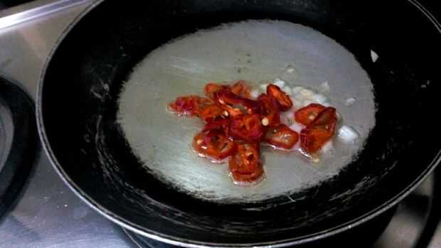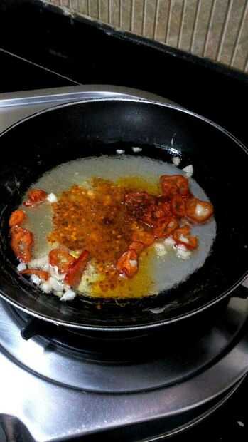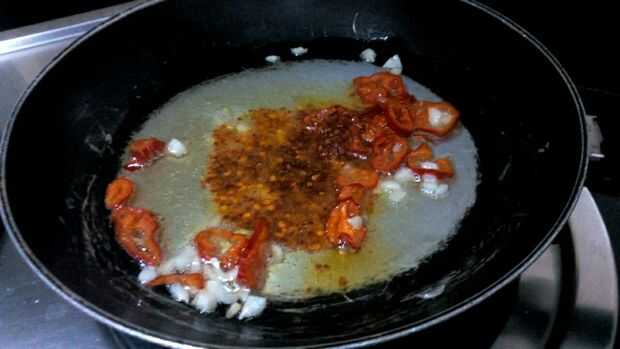 1. Heat oil in a pan. 2. Añadir el ajo picado, freír. 3. agregar los chiles, la cebolla y el polvo frío. Para hacer el aceite de color rojo. 4. Añadir el pimiento y freír hasta marrón.