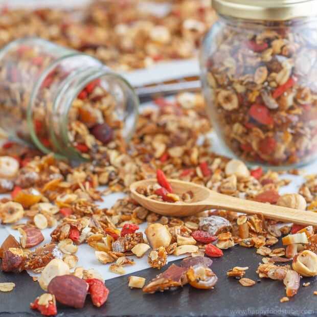 Granola casera es un bocado perfecto para cuando estás en el camino, senderismo, o simplemente para disfrutar como una alternativa saludable. Esta receta es tan versátil y que puede hacer lo que quieras con él. Uso estacional de frutos secos y semill