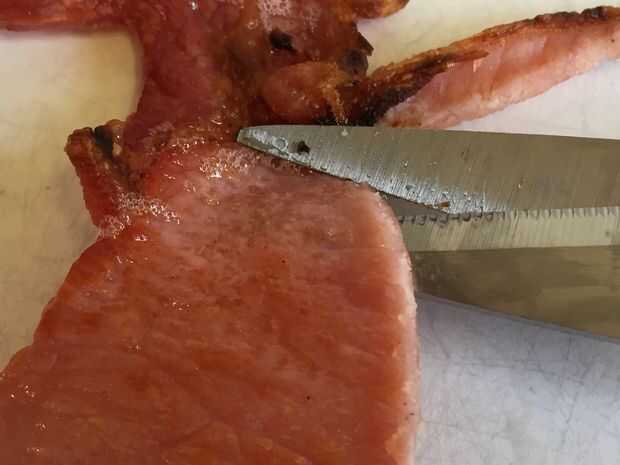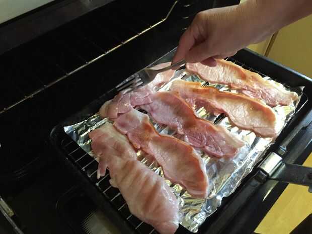 Buena espalda tocino (términos locales pueden variar) a la plancha (asado) hasta el rojo oscuro y ajustado para eliminar toda la grasa.
