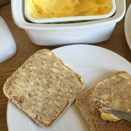 Aplique una capa delgada de su propagación favorito tales como mantequilla o un aceite de oliva, basado como se utiliza aquí.