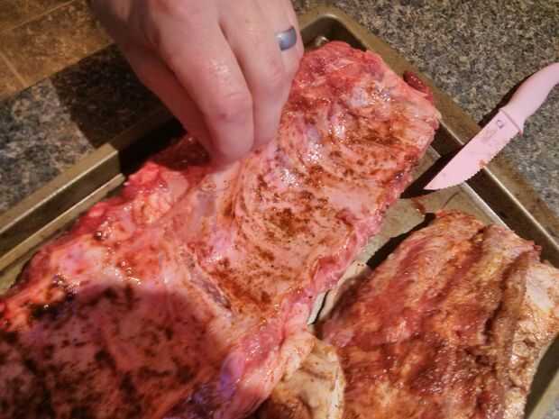 Opcional: yo generalmente al hilo de la fina membrana en el interior de las costillas que las hace aún más «caiga el hueso"bien.
