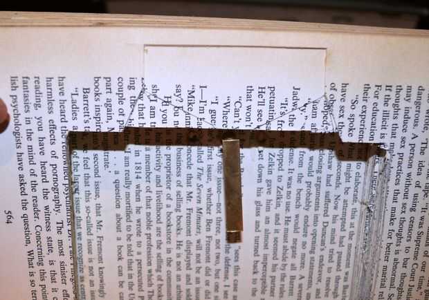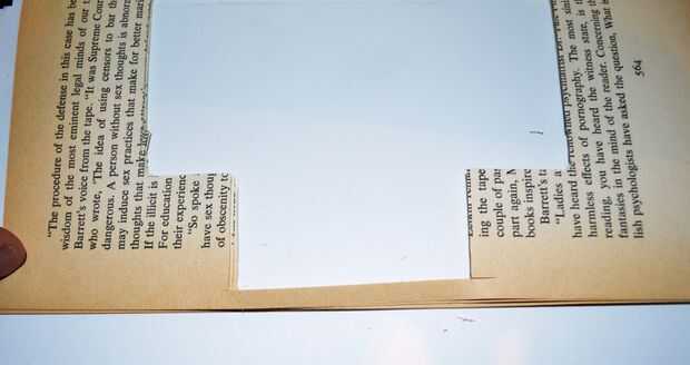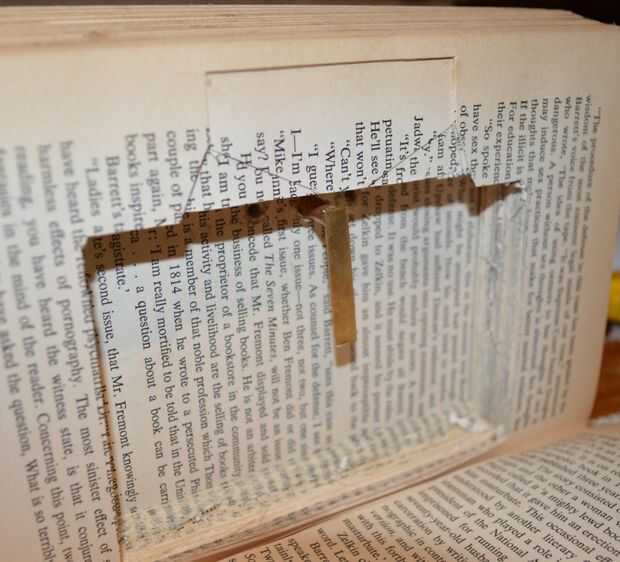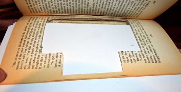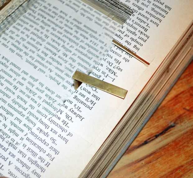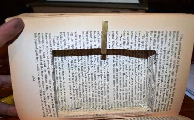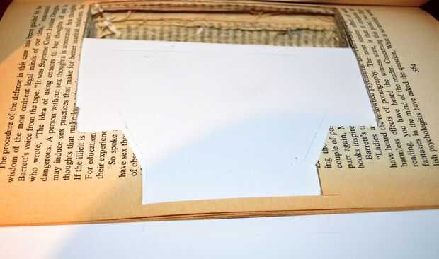 2. luego cortar la sección marcada a unos 5-10 páginas profundo (dependiendo de cómo gruesas son sus páginas) y prueba otra vez con el brazo - vea abajo. El pestillo debe hacia debajo del libro a medio camino del libro tal como se muestra a continuación.