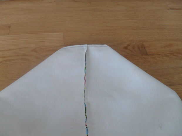 Tomar una de las esquinas y colocar para que la costura que acaba de hacer va por la mitad. Corte 2 un 1/4 pulgadas del clip de costura y cose a través del corte. Lo mismo al otro lado.