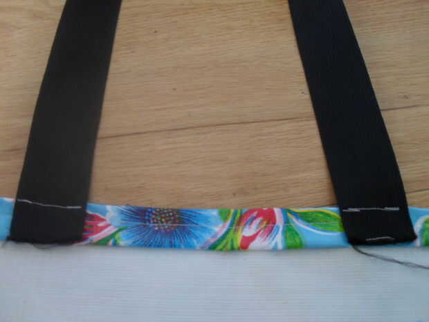 Tomar el 64" de correa y cortar por la mitad, haciendo dos correas de 32". Coserlas a la bolsa sobre la costura varias veces en una X grande o dos líneas. Asegúrese de que ambas cintas son aún y libre de nudos y torceduras.