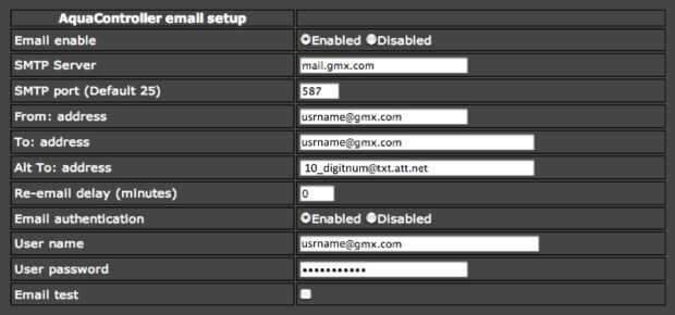 2. también debe asegurarse de que el regulador Apex está configurado para enviar mensajes de correo electrónico. Ir a configurar - red. Bajo el encabezado de Ethernet debe comprobar para asegurarse de que la dirección DNS es correcta (generalmente puede encontrar este número escribiendo la dirección IP del router en el navegador). Bajo la dirección de correo electrónico debe configurar Habilitar correo electrónico habilitado y escriba su información de servidor de correo electrónico. La información del servidor es específica con su proveedor de correo electrónico y algunos proveedores son más complicados de interfaz con el ápice. La imagen de ejemplo que puse es para una cuenta de correo electrónico gmx, para otras cuentas que usted debe leer este foro para encontrar la configuración adecuada para su proveedor de correo. Una vez que haya terminado usted puede probar que su correo electrónico funciona pulsando el botón correo electrónico de prueba y luego actualización de configuración de correo electrónico. Si no funciona, intente cambiar el puerto SMTP de 25 (el puerto predeterminado) a otro puerto compatible de su proveedor de correo electrónico.