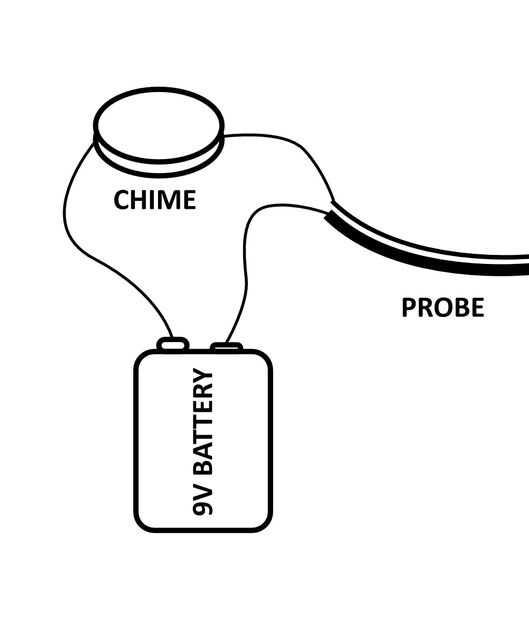 1. el circuito necesita poner juntos podría ser más simple! Tiene sólo tres componentes: el timbre electrónico, una batería de 9V y la sonda del sensor. Utilice un clip de la batería para la batería de 9V y conectar la punta positiva en el timbre y conectar el lado negativo de la campanilla a cualquiera de los dos cables en la sonda del sensor. Conecte el otro cable de la sonda del sensor al cable negativo de la pinza de la batería y listo! Usted podría soldar los cables entre sí o usar prensar en conectores (aislados) para una conexión menos permanente.