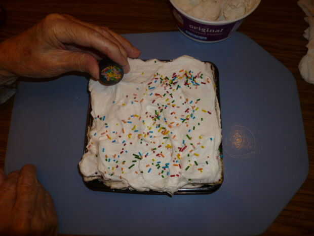 Si quieres hacer el pastel de mirar bastante, añadir algunas salpicaduras sobre la última capa de cubierta batida.