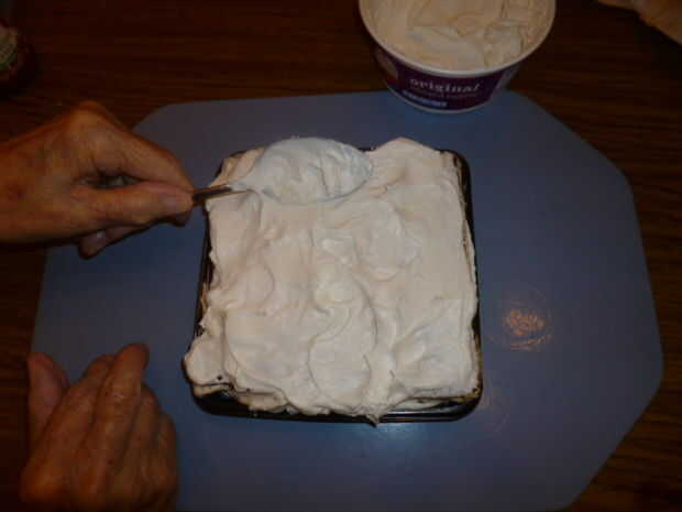 Luego, coloque una segunda capa de sándwiches de helado (sin envolver) encima de la batida. Repita por difundir una segunda capa de cubierta batida.