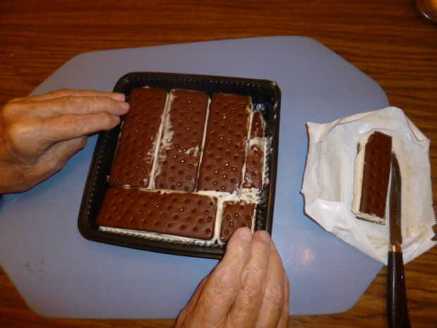 Desenvuelva los sándwiches de helado y capa de la parte inferior del plato con ellos. (No te preocupes cómo desordenado parece).