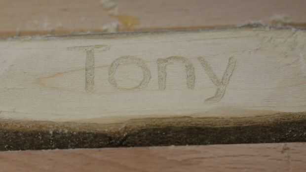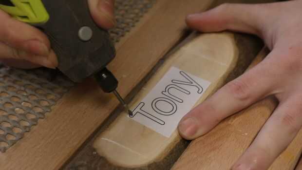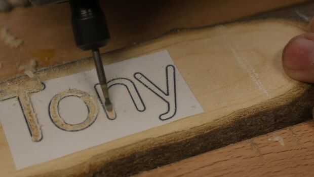 Luego usé una pequeña herramienta giratoria para tallar las letras. La profundidad no importa, acabo de hacer que las letras fueron talladas por debajo de la superficie de la madera circundante.