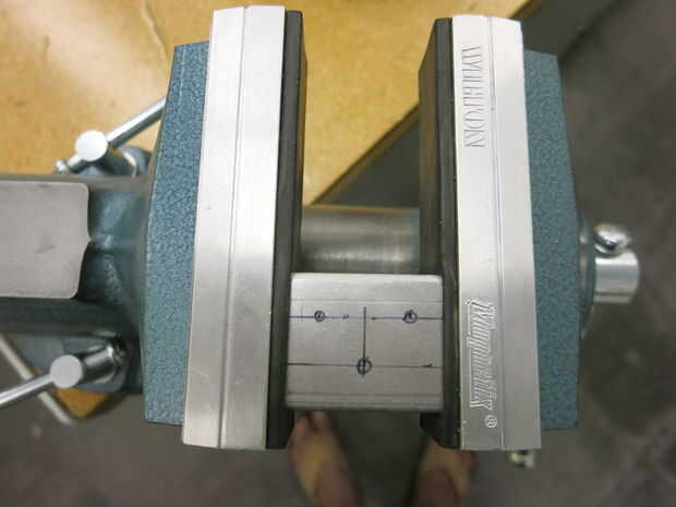 Coloca los agujeros (todas 1/4") yo mismo y aseguró que el agujero en el plano inclinado era lo suficientemente alto como para borrar los cables y contactos por debajo. Usé un tornillo de banco para sujetar las piezas para centro de golpe los agujeros. Luego pensé... bueno, ¿por qué no del taladro en su lugar??