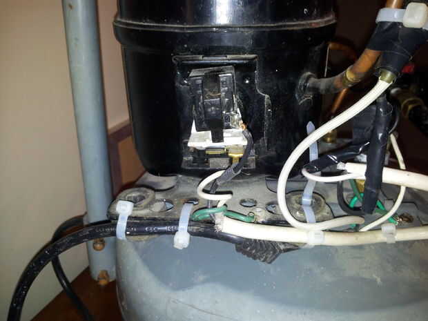 En el lado de la unidad, usted encontrará la conexión de sobrecarga térmica. En la segunda foto se pueden ver las conexiones. Debe tomar nota de cómo está conectado cuando se saca de la nevera o enfriador y cable usando los mismos colores, con el cable a tierra conectado al cuerpo de la propia unidad. Existe una sobrecarga térmica incorporada en cada unidad que lo protege. Un defecto con un compresor de nevera es que si usted había apagado, girar inmediato, dará el pistoletazo de la sobrecarga térmica. No se preocupe si esto ocurre. Sólo espere unos segundos y vuelva a intentarlo. La sobrecarga térmica debe reiniciarse. También a proteger la unidad de subidas, en caso de fudge el cableado como lo hice en la primera unidad que construí.