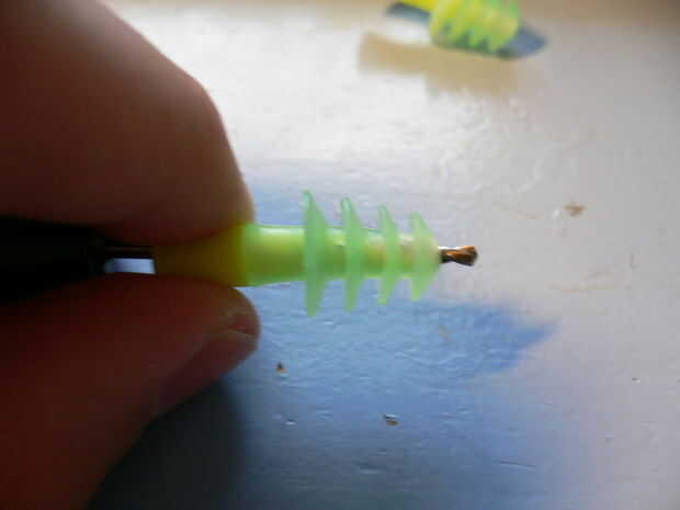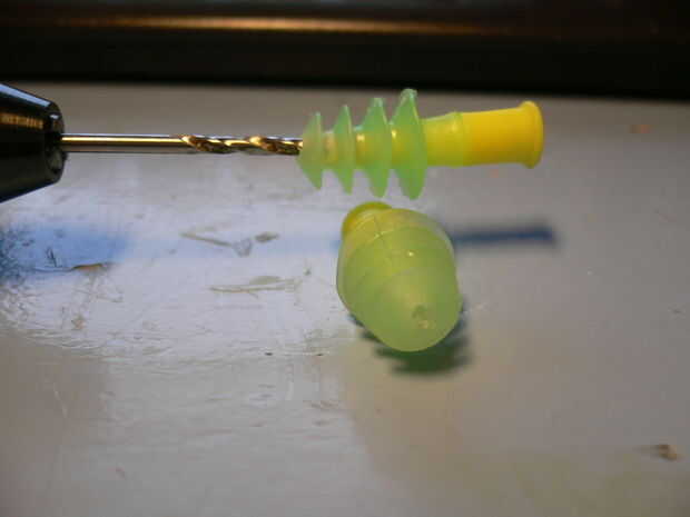 Para perforar los orificios, utilice una broca pequeña (1/16?) y a bajas revoluciones. Sujete el tapón completamente, para evitar que se hace girar fuera de control o torcer demasiado. También, ligeramente squeze el enchufe para permitir que la broca quitar algunos del silicio. Esto debe crear un pequeño túnel a través del tapón.