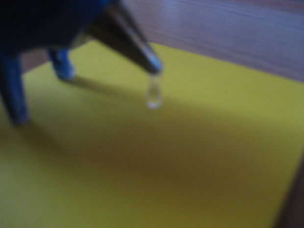 Para este paso colocar la nota Post-It en una superficie plana y coloque la pistola encoladora sobre él como se muestra en la imagen. Luego, sólo espera y el pegamento caliente lentamente deben gotear en el post se nota y formar bolitas. Estas bolitas son nuestra munición.
