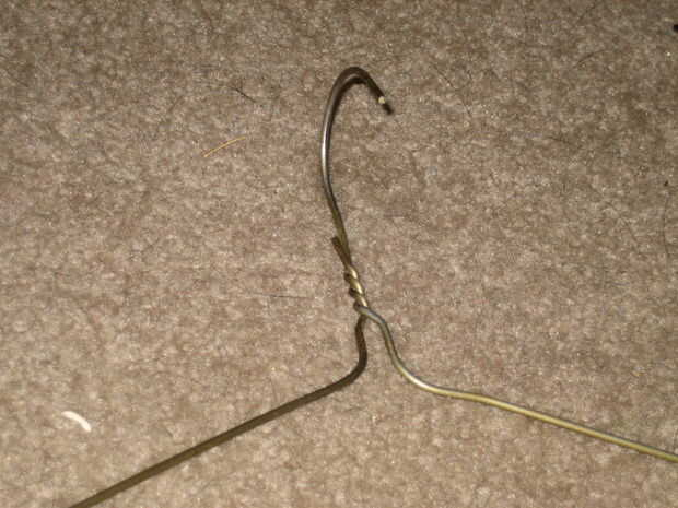 Tomar el gancho de la percha y use sus manos para doblarla unos 90 * (grados) como se muestra en la imagen