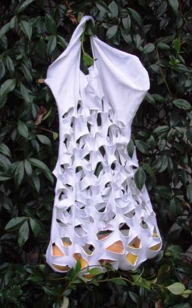 6. cuando corte terminado, revise el lado opuesto de la bolsa para asegurarse de que la línea ha cortado a través de ambas capas de la camiseta. Ampliar aberturas si es necesario con tijeras. El tamaño de las aberturas y la distancia de que cada fila es a otra determina la apariencia final y tan abierto es. Vuelta de adentro hacia afuera.