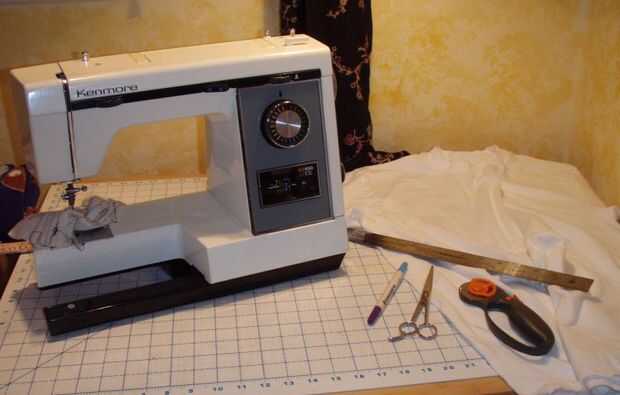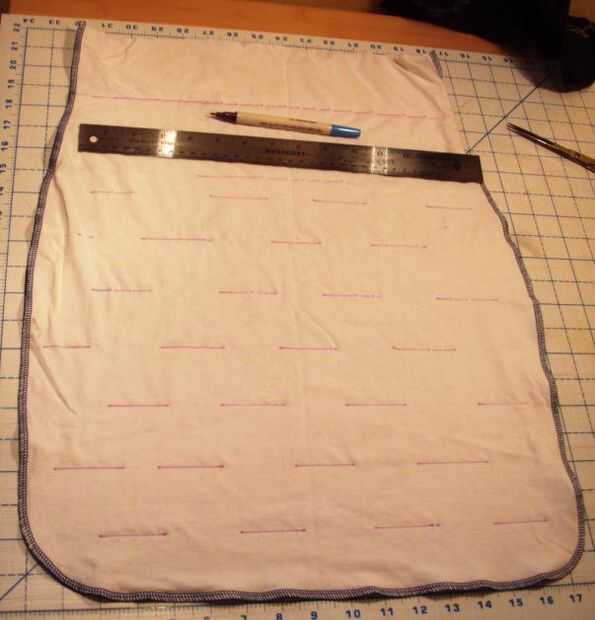 2. con la ayuda de una regla, marque la línea de costura de la bolsa de comestibles en los bordes de la camiseta con desaparecen marcador de tinta o rotulador. Activar revés cuando esté completo, así que cualquier marcas de rotulador que no laven será en el interior.