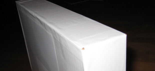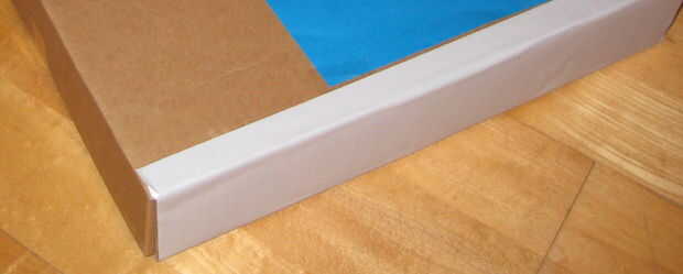 Comencé poniendo dos trozos de plástico blanco en los extremos cortos de mi caja. Luego usé un pedazo grande de plástico para cubrir la parte superior la caja toda, traslapando el otro plástico, con los extremos envolver alrededor de los lados de la caja en la parte inferior.